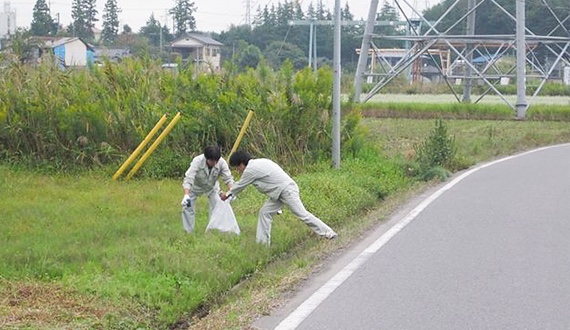 本社地区では会社施設周辺(公道沿いを中心に)を、古河地区では工業団地内を近隣企業と共同で、地域美化運動の一環として清掃を行っています。